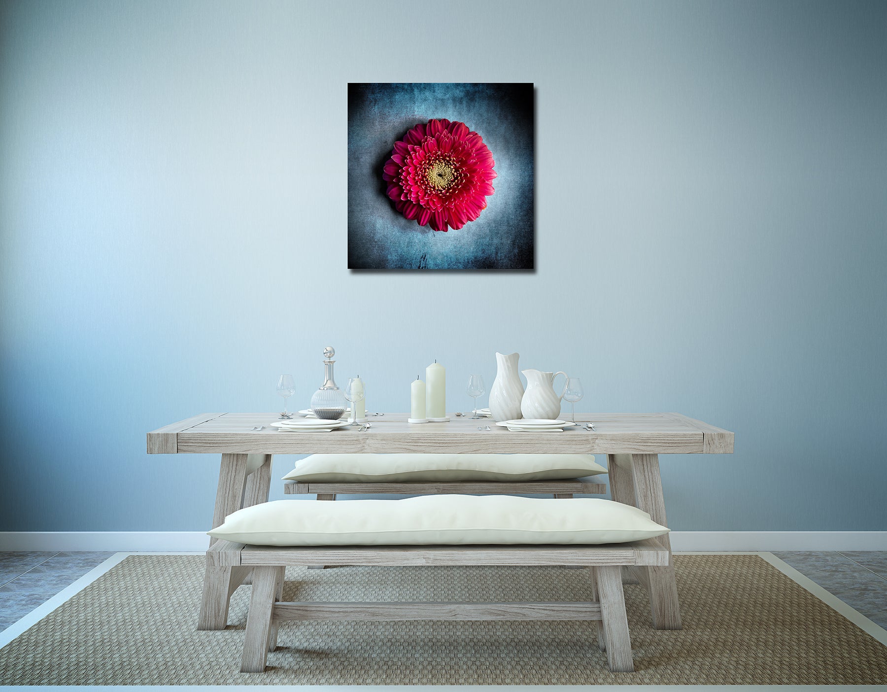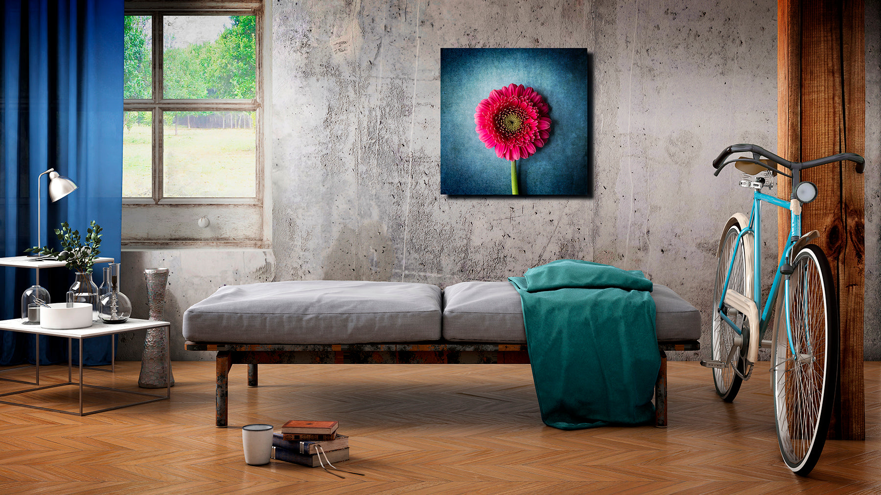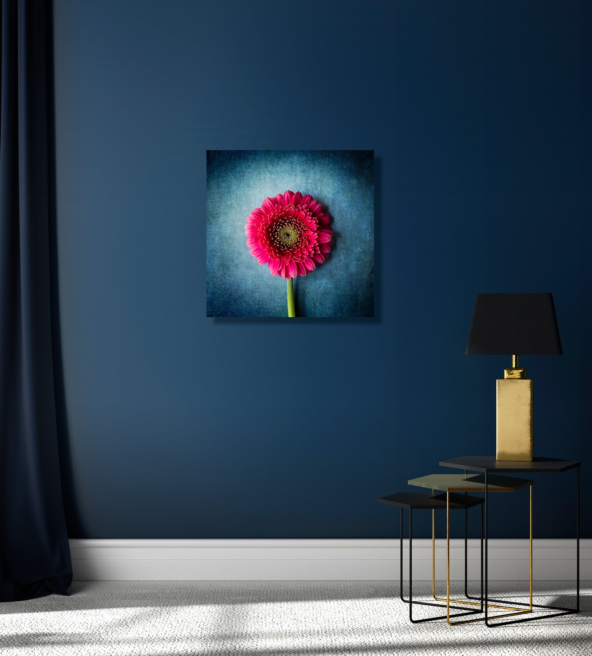 Die intensiv rote Gerbera steht in spannungsvollem Kontrast zu einem kühlen, strukturierten Hintergrund. Die leuchtende Mitte und die detailreiche Blütenstruktur erzeugen eine dynamische, fast vibrierende Wirkung.