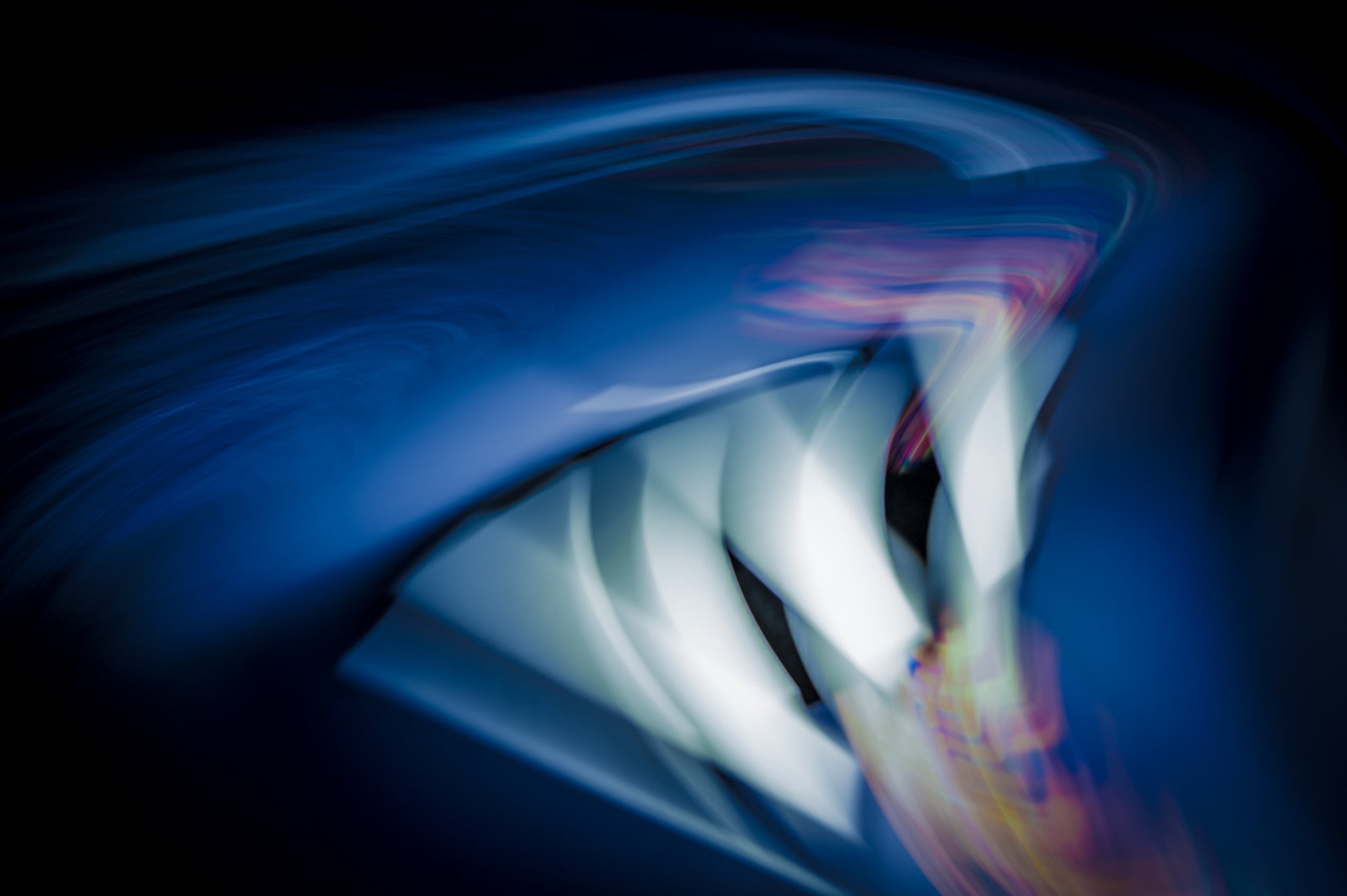 Midnight Current ist ein atmosphärischer Fine Art Print aus der Liquid Light Kollektion. Fließende Lichtbahnen in tiefem Blau, kühlem Weiß und zarten Violettnuancen formen eine geheimnisvolle Bewegung im Raum.